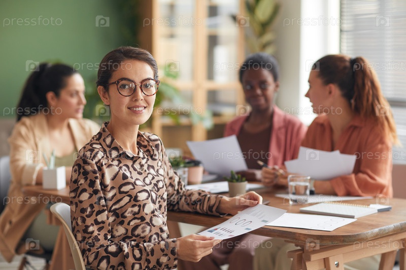 Молодая бизнесвуменка смотрит на камеру во время встречи