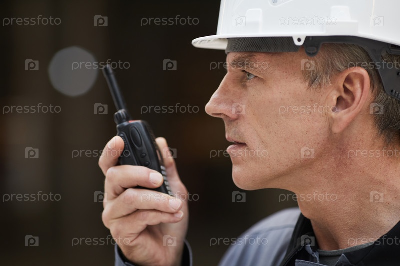 Строительный рабочий говорит по радио Side View