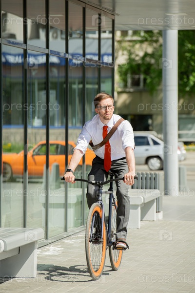 Современный молодой бизнесмен катается на велосипеде в солнечный летний день