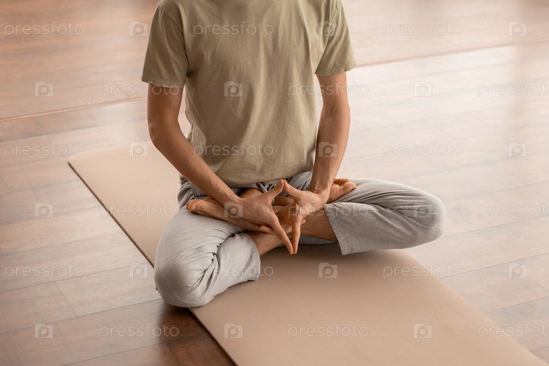 Низкий участок молодого человека, сидящего на коврике и держащего руки между скрещенными ногами