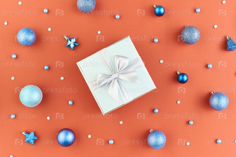 Белая коробка с рождественским подарком со связанным узлом наверху, окруженная украшениями