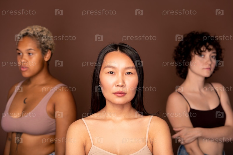 Молодая серьезная азиатская женщина в бежевом танкоре, стоящая против двух других женщин