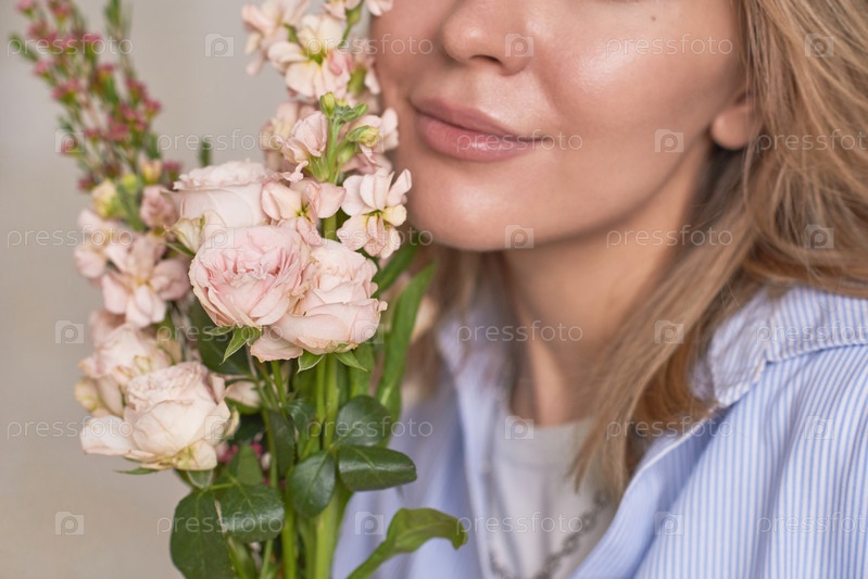Горизонтальный крупный студийный портрет молодой женщины, держащей красивый букет бледно-розовых цветов рядом с лицом