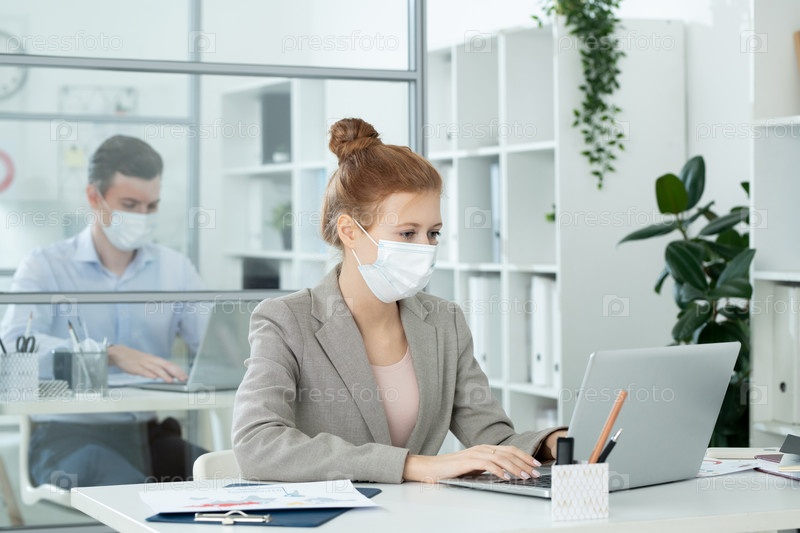 Молодая деловая женщина в защитной маске и сером костюме смотрит на дисплей ноутбука