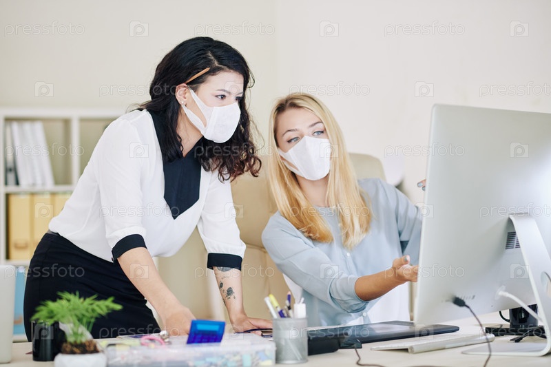 Женщины-предприниматели в медицинских масках, работающие в офисе