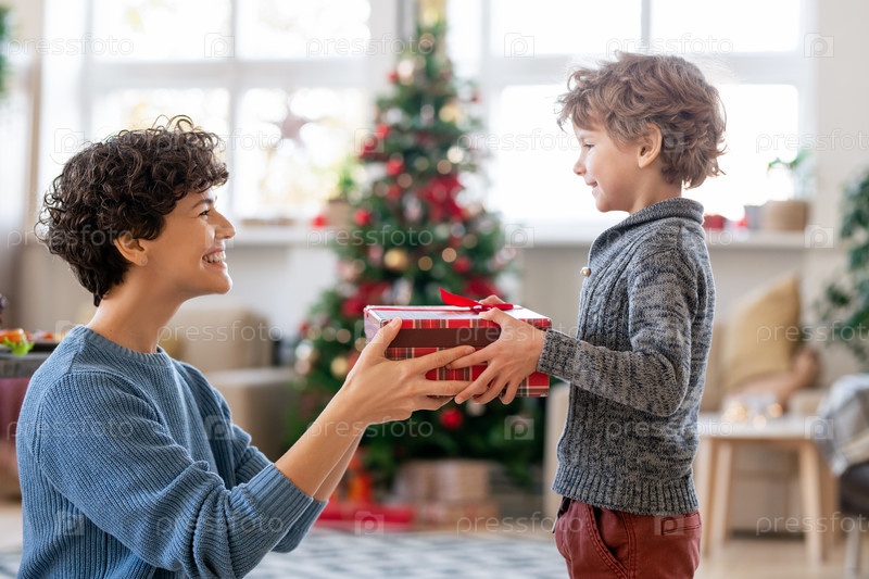 Молодая смеющаяся мать передает рождественский подарок своему очаровательному маленькому сыну дома