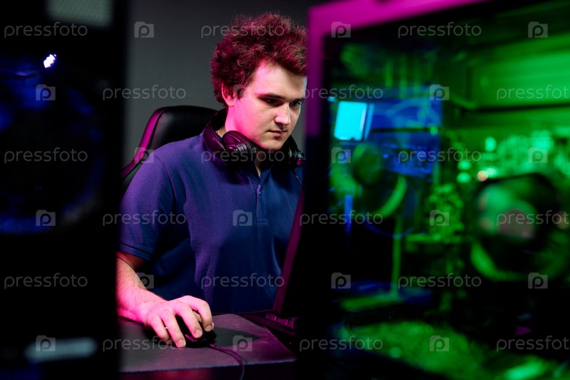Серьезный парень с наушниками смотрит на экран компьютера во время кибер-игры в электронном спорте