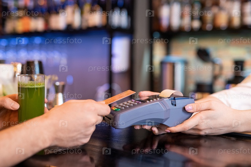 Рука молодого человека, держащего пластиковую карту над платежным автоматом, которую держит официантка