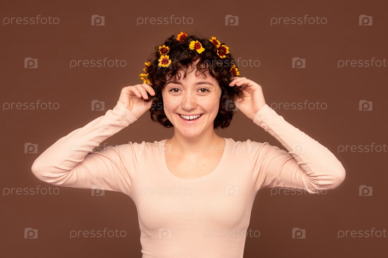 Веселая молодая брюнетка-женщина этнической принадлежности с маленькими цветами в волосах