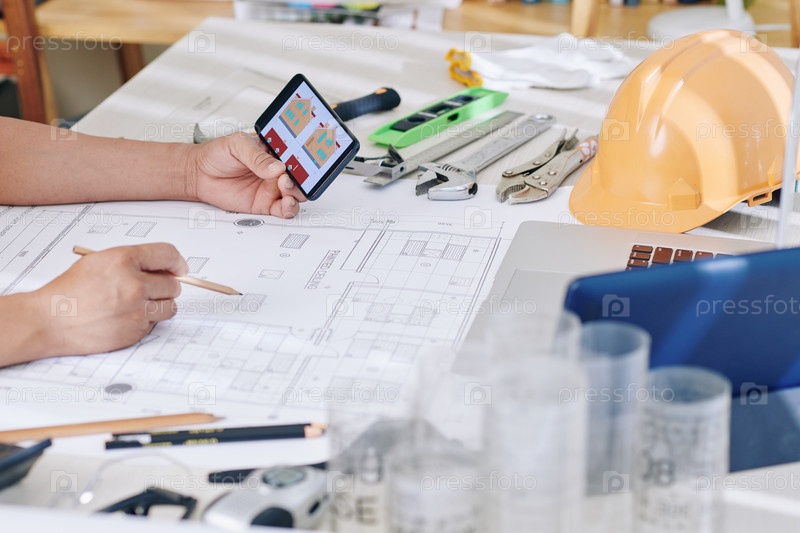 Строительный инженер проверяет план