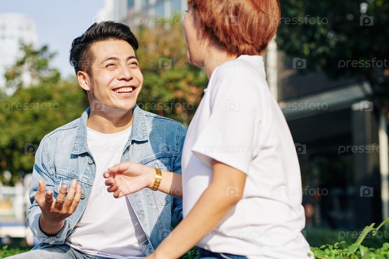 Счастливая пара, беседующая на открытом воздухе