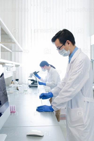 Молодой фармацевт или исследователь тестирует новую вакцину с коллегой на фоне
