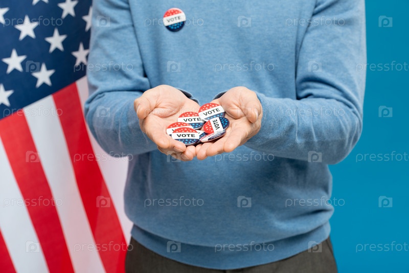 Руки молодого современного бизнесмена, показывающие групповые значки голосования
