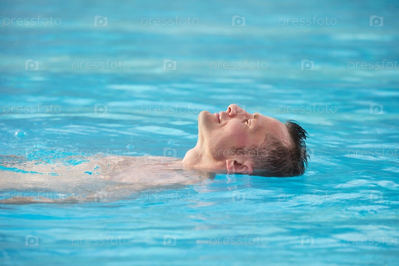 Голова расслабленного мужчины, держащего глаза закрытыми и наслаждающегося теплой водой