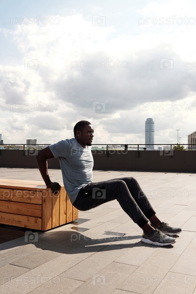 Черный молодой человек занимается спортом в городе