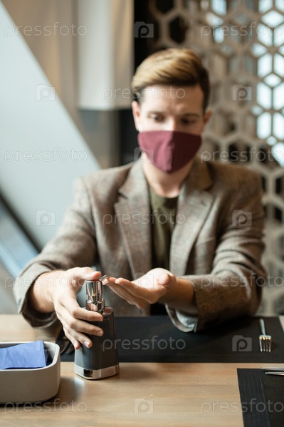 Руки парня, нажимающего диспенсер пластмассового банка с дезинфицирующим средством перед ужином