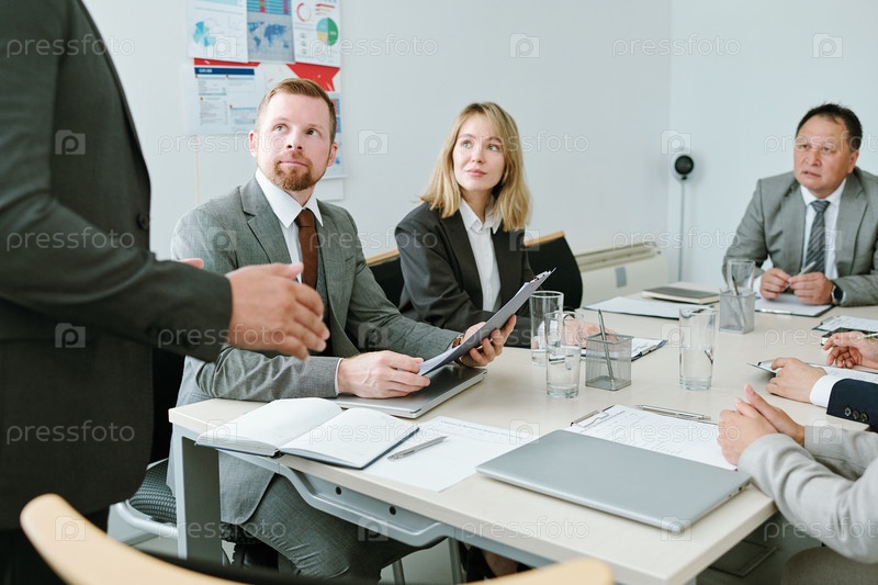 Группа серьезных брокеров в формальной одежде, смотрящих и слушающих оратора
