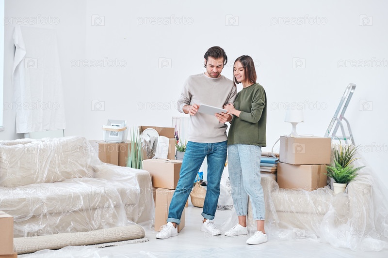 Молодой ласковый мужчина и женщина в повседневной одежде смотрят на цифровой дисплей планшета