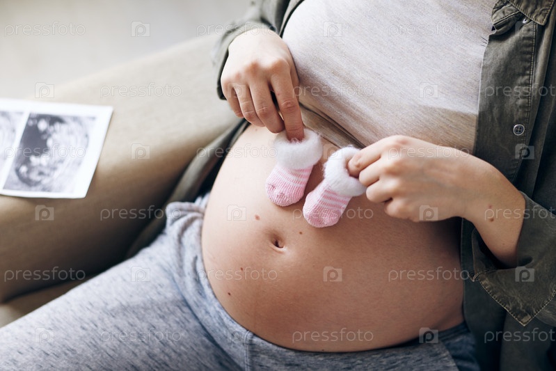 Руки молодой беременной женщины, держащей крошечные носки для своего будущего ребенка на животе