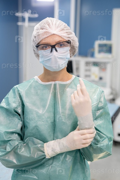 Молодой профессиональный хирург в защитной рабочей одежде стоит в операционной