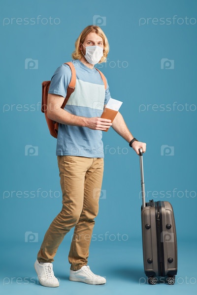 Турист в маске с багажом
