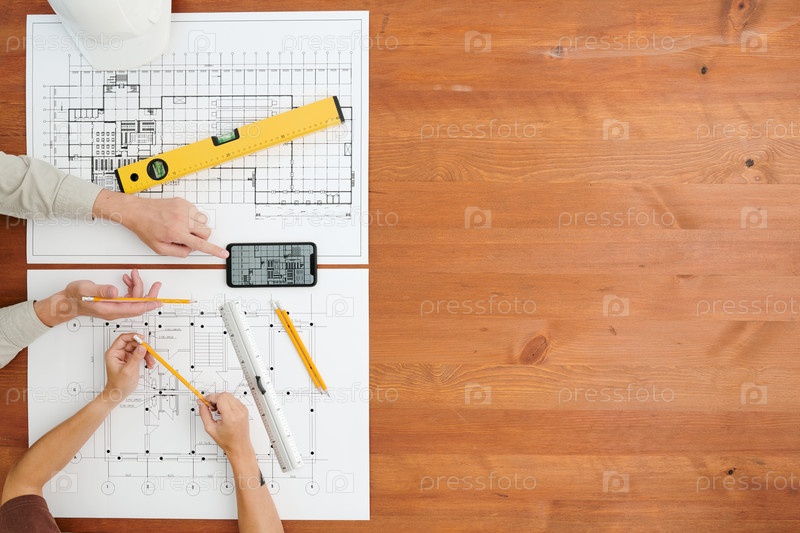 Обзор рук двух инженеров или строителей, делающих новые эскизы по таблице