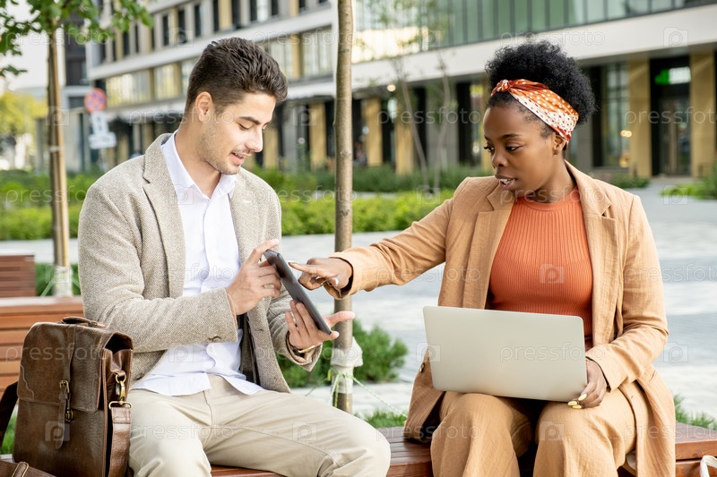 Молодая уверенная в себе бизнесвумен африканской этнической принадлежности, указывающая на экран планшета