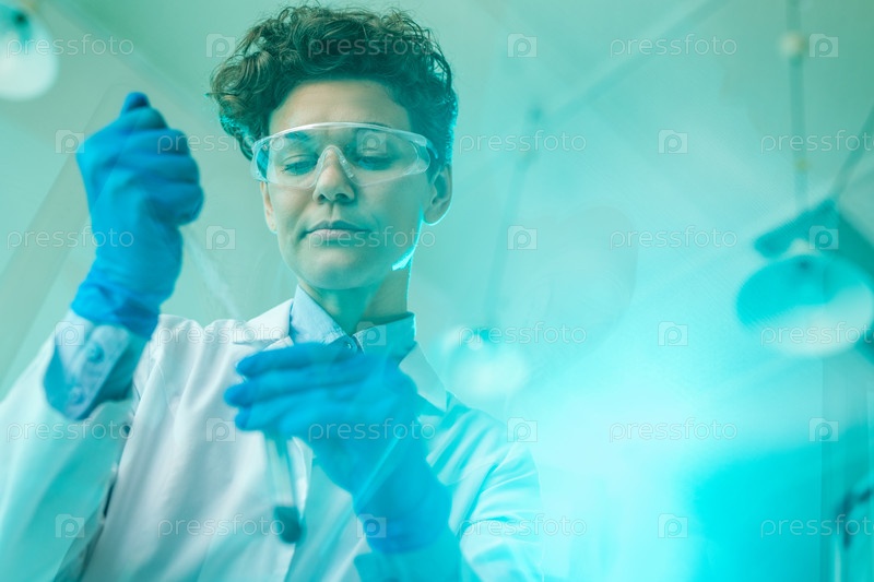 Молодая женщина-ученый или исследовательница сбрасывает химическое вещество в колбу