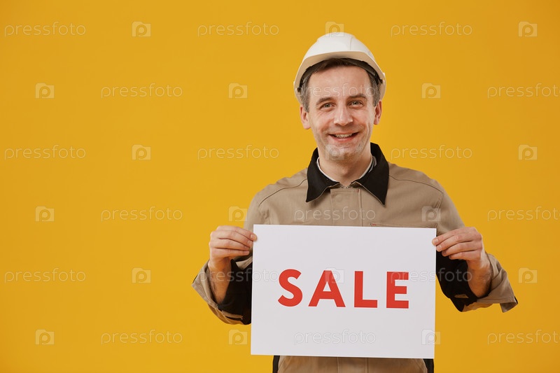 Улыбающийся рабочий удерживает знак продажи на желтом