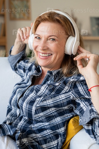 Счастливая зрелая женщина с зубчатой улыбкой, слушающая музыку в наушниках