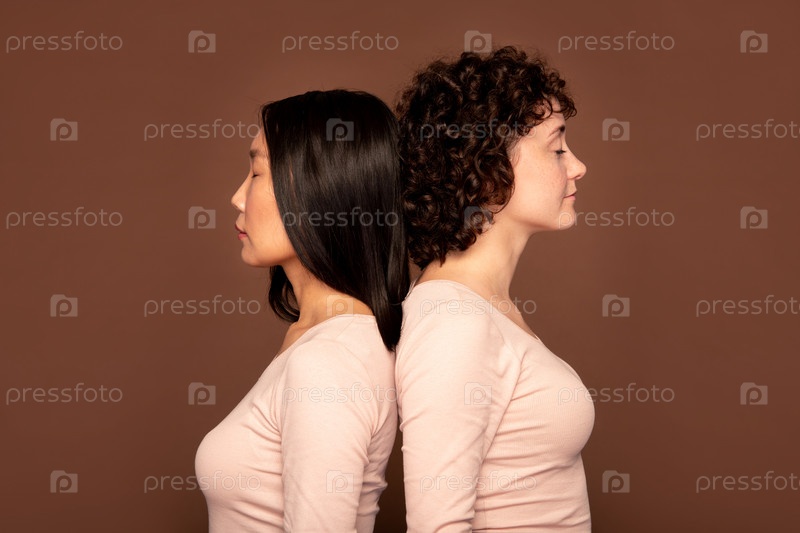 Две молодые межкультурные женщины в белых пуловерах, держащие глаза закрытыми