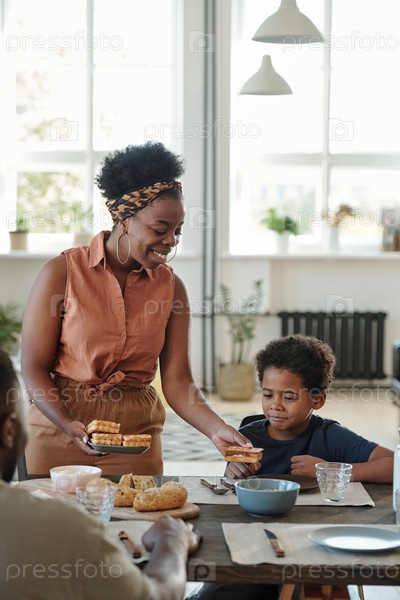 Молодая красивая мать в повседневной одежде передает домашнюю выпечку своему милому маленькому сыну