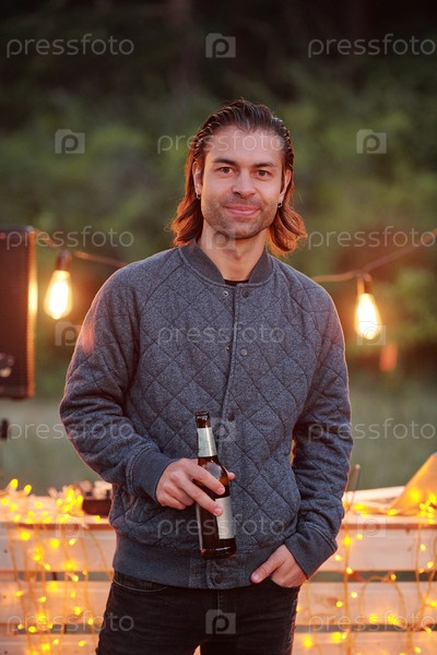 Случайный молодой человек с бутылкой пива, стоящий перед камерой на вечеринке