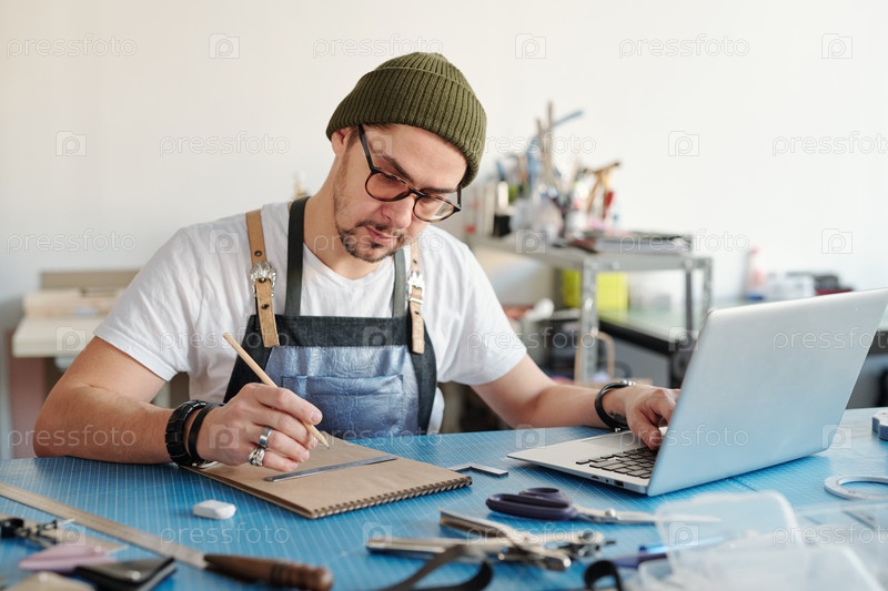 Молодой красивый кожевенник в фартуке и шляпе с шапочкой делает эскиз в блокноте