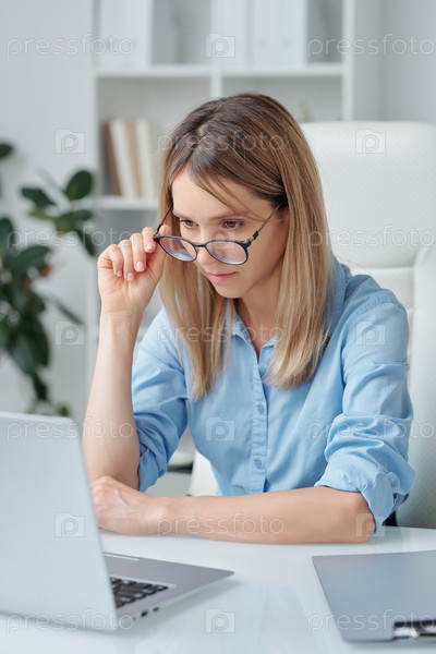 Блондинка довольно самоуверенная бизнес-леди в синей рубашке смотрит на данные на дисплее