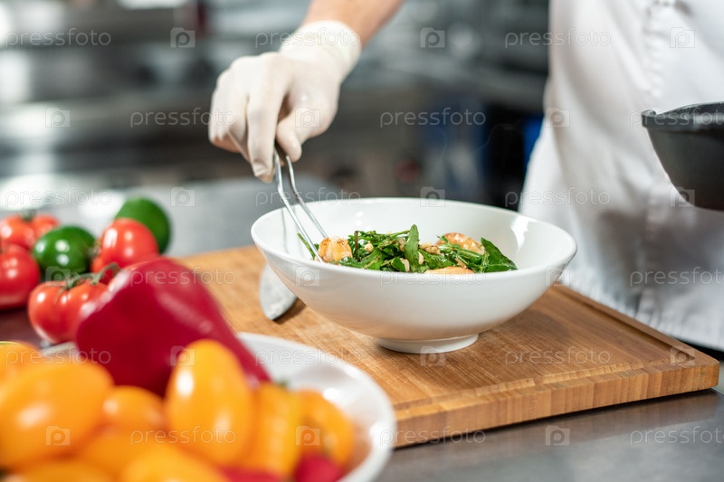 Перчатковая рука молодого повара с вилкой, помещающей приготовленное блюдо в белую керамическую тарелку