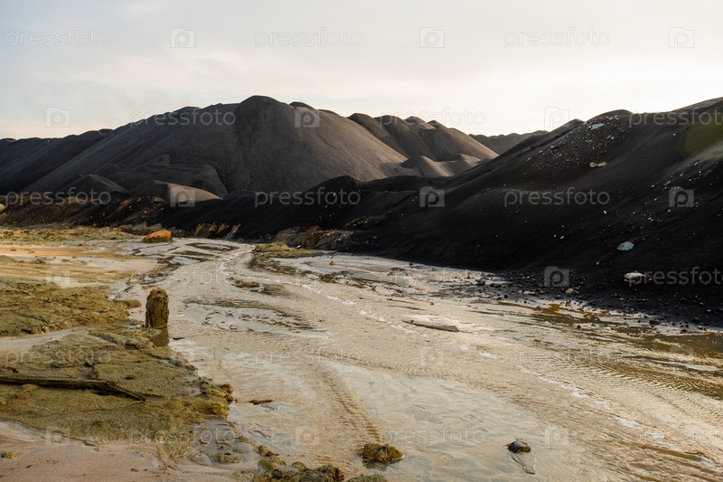 Заброшенная непригодная для использования территория с грязной водой в реке и загрязненным грунтом