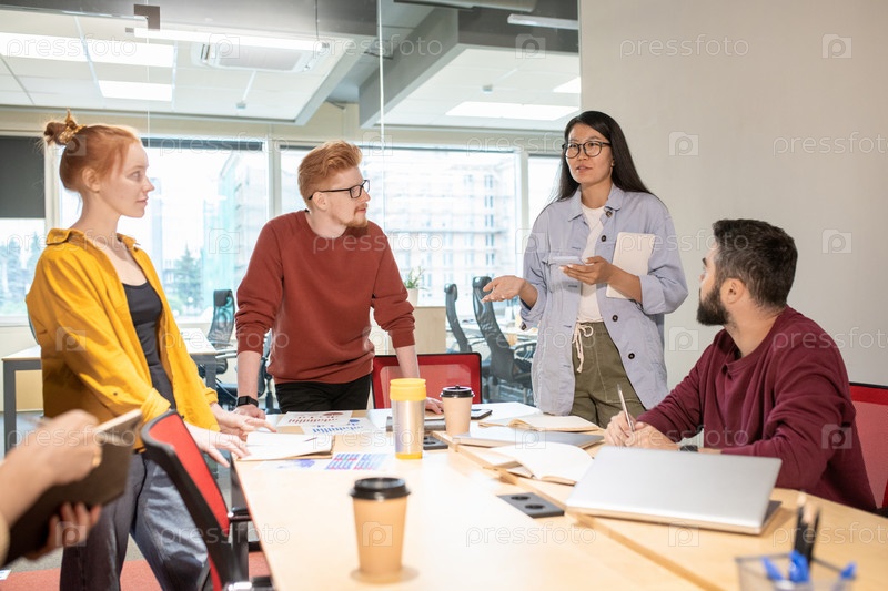 Молодая азиатская брокерша стоит за столом и объясняет свою точку зрения