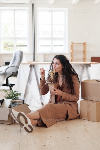 Вдумчивая молодая бизнес-леди с длинными кудрявыми волосами сидит среди коробки на полу и ест китайскую еду в офисе во время ремонта