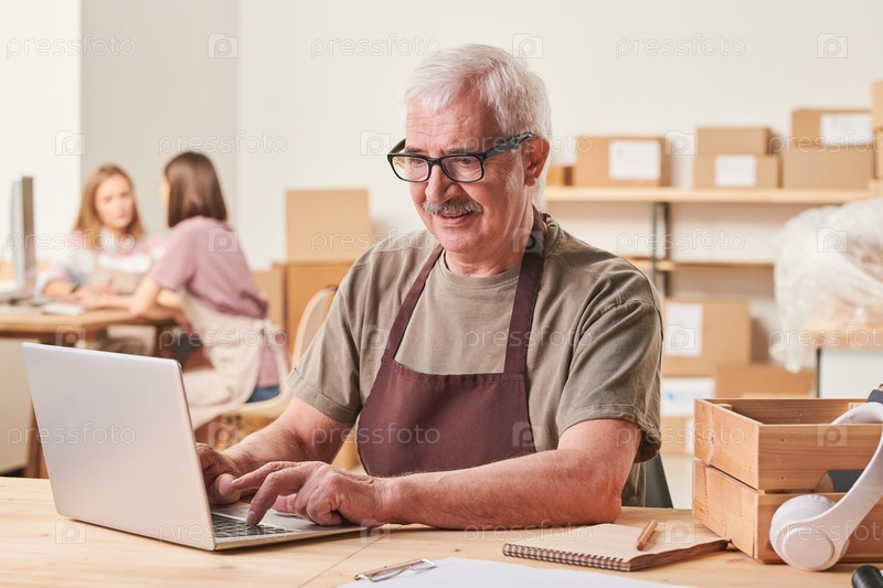 Вдохновленный современным старшим человеком в очках и фартуке, сидящим за столом и печатающим на ноутбуке во время работы в хранилище