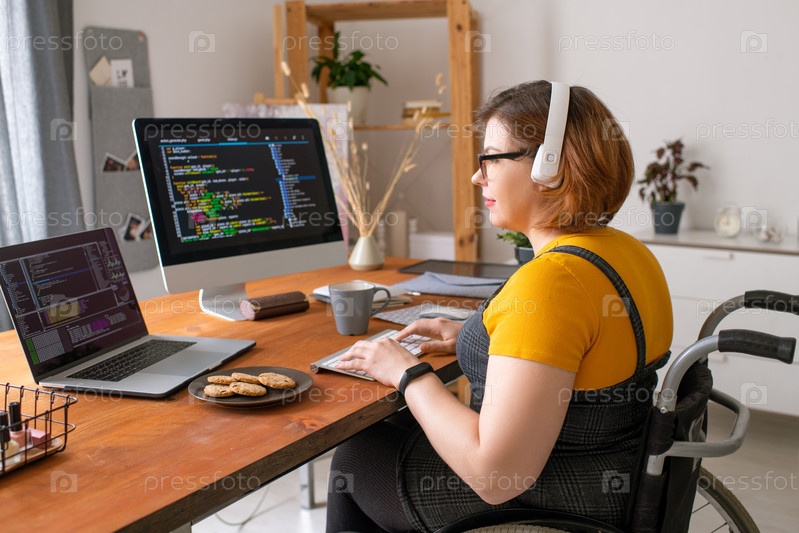 Молодая красивая женщина-разработчик программного обеспечения в инвалидном кресле, работающая с данными дома