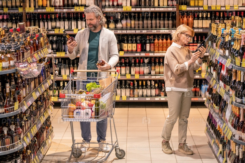 Пожилой клиент-мужчина выбирает коньяк, пока его жена пьёт бутылку шампанского
