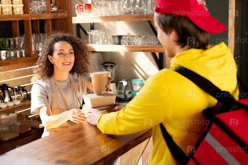 Счастливая молодая официантка ресторана или кафе ставит стакан кофе на контейнер
