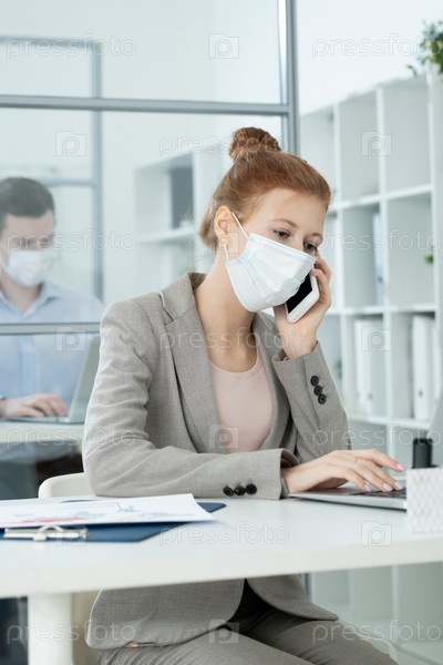 Красивая молодая бизнес-леди в защитной маске смотрит на дисплей ноутбука на работе