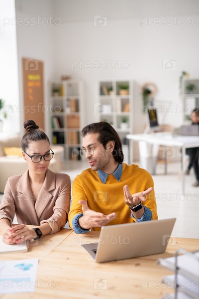 Молодой уверенный в себе бизнесмен объясняет онлайн-данные своему коллеге