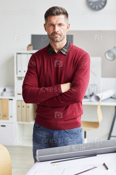 Зрелый архитектор позирует на рабочем месте