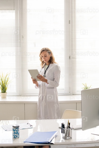 Молодая клиницистка с длинными светлыми волосами использует планшет во время работы в больнице