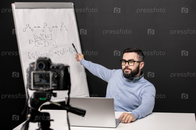 Молодая самоуверенная учительница указывает на доску с химическими формулами