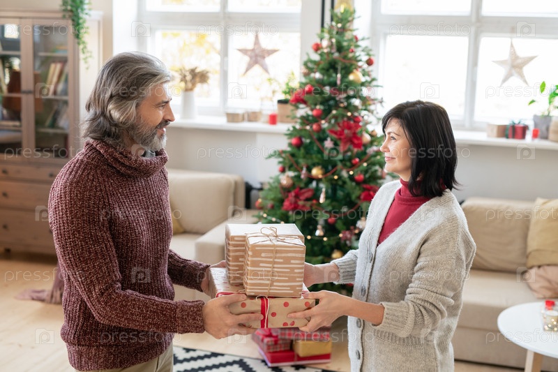 Счастливый зрелый мужчина передает три коробки подарков своей красивой жене, глядя на нее