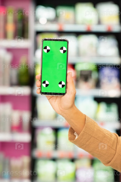Рука женщины-шопоголика, держащей смартфон с зеленым электронным купоном на экране